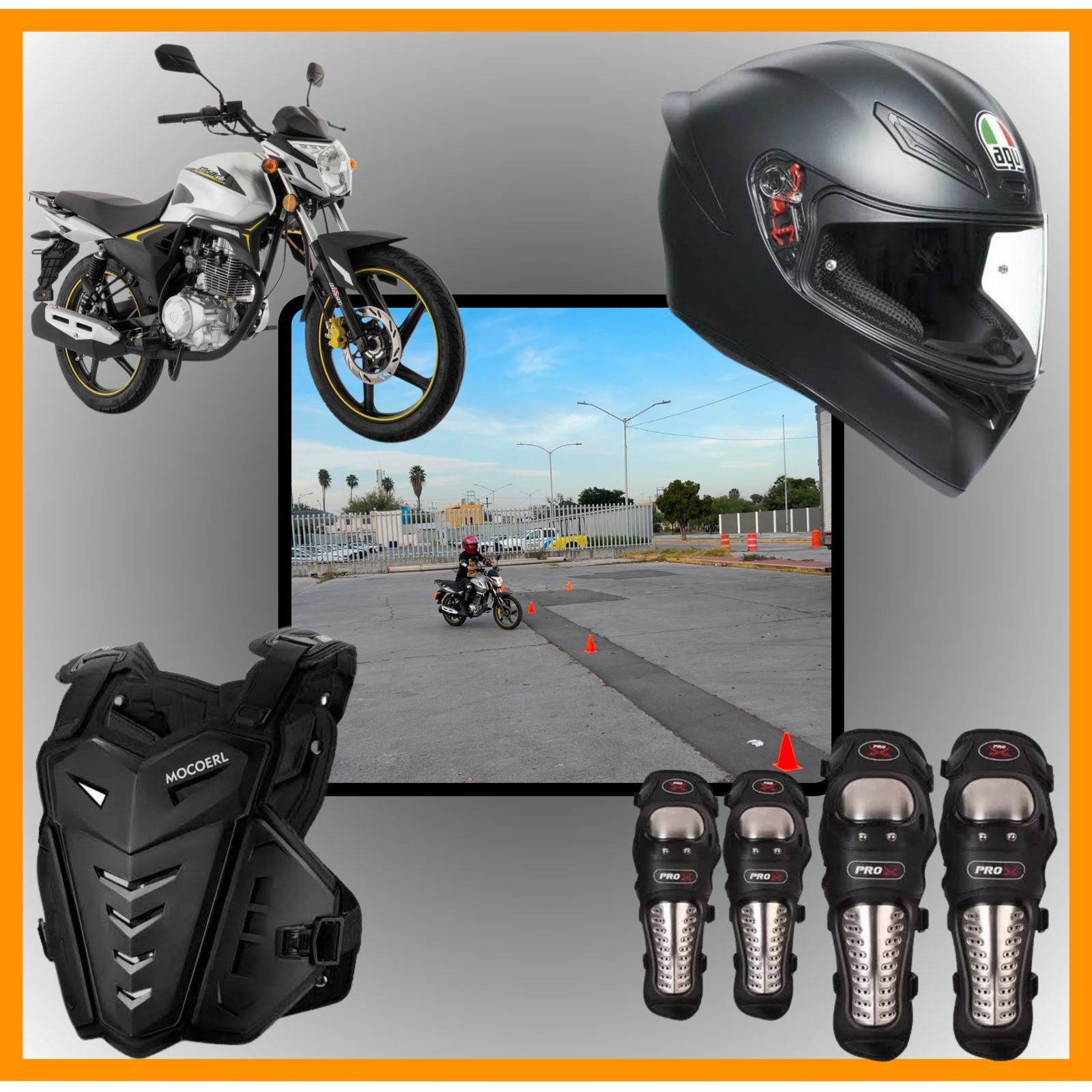 Para las clases se le entregara al alumno un kit de seguridad en la cual consta de casco, pechera, coderas junto con unas rodilleras reforzadas. Asi como una motocicleta ft150gts de la marca Italika..